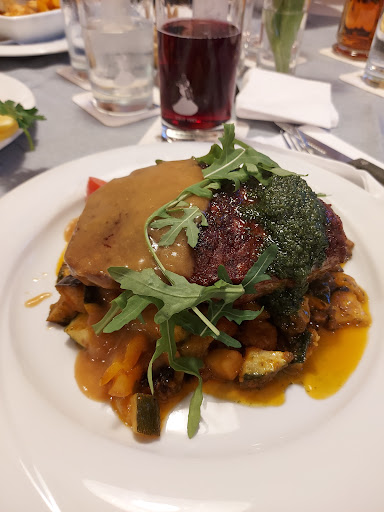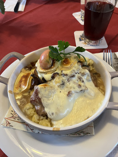 Ausgesprochen lecker war das. Besonders erfreulich ist, dass es fleischfreie Alternativen gibt, die nicht - wie man es gewohnt ist - irgendwie lieblos auf Karte und Teller geklatscht sind, sondern richtig gut zusammengestellt und dann auch noch handwerklich super umgesetzt werden. Heute zum Beispiel die Aubergine mit Kartoffeln, Halloumi und Yoghurt-Pfefferminz-Sauce, sehr geil; das war geschmacklich so gut durchdacht, dass die beiliegende Orangenscheibe nicht nur Deko war, sondern geschmacklich sinniger Kontrapunkt in einer klangstarken Partitur. Jo sauba die Hoa gschnied'n! Ebenso die Blunsen - hammer: gute Ausgangsprodukte, die zu richtig guten Kompositionen kombiniert werden. Das Cordon Bleu sah richtig gut aus. Das Wiener Backhendl war rösch as can be - leiwand! Das Steak sah on point aus, ebenso der Merch. Schad, dass kein Kaiserschmarrn mehr reingepasst hat, der ging auf dem Weg zum Nachbartisch kurz an uns vorüber und sollte, so wie der ausgesehen hat, wohl besser als Hauptgericht verschmaust werden. Hochgelobt wurde auch der Salatteller - den leider nicht alle am Tisch bekommen haben, was schade ist, weil er wohl echt gut war. Kurzum (und ich wiederhole mich): das war echt richtig, richtig gut. Da lupfe ich den Hut richtung Küche und bedanke mich ausdrücklich nochmal besonders für die hervorragenden, fleischfreien Gerichte auf der Karte! Starke Leistung....