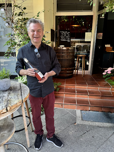 Wir fanden mit Bekannten freie Plätze an kleinen Tischchen an der Hauswand. Auf die Frage der freundlichen Bedienung, ob wir auch Essen ordern möchten antworteten wir, dass wir lediglich Getränke wünschen und bestellten Wein und Bier.