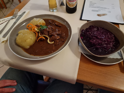 Auf Grund von Empfehlung betraten wir die Stuben. Das Personal - sehr freundlich. Sitzplätze waren reichlich vorhanden, hatten wohl eine Zeit erwischt wo wohl wenig Betrieb war. Speiseangebot nicht riesig, aber das muss auch nicht immer sein , wenn das Essen stimmt. Und da kommen wir zu dem Problem .Es wurde bestellt Schweinebäckchen und Hirschgoulasch, beides mit Rotkohl und Klöße. Schweinebäckchen Menge sehr überschaubar, Geschmacklich fade, schlecht abgeschmeckt. Genauso Hirschgoulasch Menge ok, Geschmack entfernt an Wild gelehnt. Vermißt habe ich, wie es in jedem großen Genusstempel üblich ist , Preisselbeere oder ähnliches um den Wildgeschmack entgegen zu kommen. Soßen sehr wässerich. Der Rotkohl auch sehr fade, ohne richtigen Geschmack (also da hat der Apfelrotkohl von Iglo mehr Geschmack). Aber die größte Enttäuschung waren die Klöße .Eine sehr weiche schmierige Masse, die mindesten seit Stunden im Wasser gelegen hat. Da es nicht unseren Sinne liegt mit Personal zu streiten haben wir es hingenommen.Beim Verlassen der Lokalität haben wir vermutlich den Grund gesehen. Die Riesenküche war leer , bis auf eine einzelne Frau (sah nicht nach Köchin aus) die aus scheinbar vorbereiteten Teilen das Essen zusammenstellte. Also Personalmangel wie überall. Ich vermute bei Hochbetrieb wird das Essen besser und frischer sein. Schade ,aber so ist Leben Kleine Tip nebenbei.Der Weg zur Toilette könnte besser ausgeschildert sein.Niedliches Schild an der ersten Tür.Irren durch Schloßgänge ist halt nicht jedermans Sache.