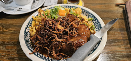 Essen: Das Essen war gutes Mittelfeld. Dazu nur folgende Anmerkungen: Das gefüllte Schnitzel (so nennt man hier quasi das Cordon Bleu) ist nicht so dick, wie man das normalerweise erwartet, sondern dünn wie ein normales Schnitzel, geschmacklich aber gut. Beim Zwiebelrostbraten wurde nicht nach dem Garpunkt gefragt, eine Umbestellung von Kässpatzen auf normale Spatzen (die eigentlich günstiger sind, weil weniger Wareneinsatz/Arbeit) wurde mit 2€ zus. berechnet - hier habe ich weder in der Speisekarte noch vorab vom Service einen Hinweis bekommen. Zudem kam der Zwiebelrostbraten quasi auf einem Kuchenteller. Da fand ich die 21,90€ (inkl. Umbestellung) "grenzwertig". Eine Rahmsoße war bitter, da man diese vermutlich nach der Zubereitung mit Weinbrand etc. "pimpen" wollte, was ohne Einkochen dann zu dieser Bitterkeit geführt hat.
