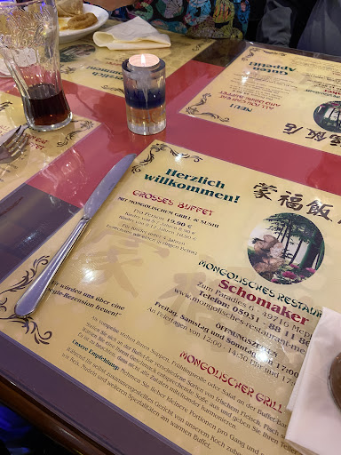 Read moreZu Beginn einmal vorweg, wir wurden von Freunden eingeladen... Ich persönlich würden ein "mongolisches Restaurant" unter dem Namen Schomaler schlichtweg nicht ansteuern. Passt einfach nicht. Nun zum Restaurant: beginnen möchte ich mit der Inneneinrichtung die größtenteils vermutlich vom Vorpächter, einer alten deutschen Gaststätte übernommen wurde - kein asiatischer Flair. Die Lampe über unserem Platz war Teildefekt, die Tapete löste sich an zahlreichen Stellen von der Wand und unsere Kunstleder Stühle sind seit einer Ewigkeit durchgesessen. Unsere Freunde hatten reserviert, aber der erste Platz der uns angeboten wurde war quasi direkt im Eingang...habe ich noch nirgendwo so erlebt, dementsprechend haben er diesen abgelehnt. Der nächste Platz war von der Lage her einigermaßen akzeptabel. Das Personal kam so gut wie kein zweites Mal an den Tisch, um nicht zu verdurstenden habe ich mich selbst auf die Suche nach einer Kellnerin begeben müssen. Das Essen war nun ja billig, kalt und wie vom Vortag. Unser ausgewähltes Fleisch für den Grill war, am ausgewählten Gemüse zu erkennen, nicht unser Fleisch! Die Nachspeisen Auswahl war in Ordnung und auch lecker. Alles im allen möchte ich nicht wissen wie es in der Küche aussieht! Das Restaurant werde ich auf keinen Fall...