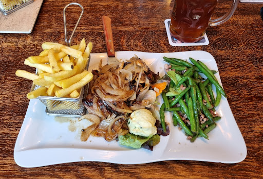 Die Steaks: Medium mit Speckbohnen , Zwiebeln/Pilzen, pommes/Bratkartoffeln. Auch bei den Steaks gab es keine Beanstandung, sie waren immer on point. Auch wird das Fleisch ruhen gelassen , was sich an der geringen Menge austretenden Fleischsaftes bemerkbar macht. Das Steak kommt schon gut gewürzt mit Pfeffer und Salz an , aber dennoch nicht überwürzt. Mit Röstzwiebeln und ebenfalls frischen gebratenen Champignons wird das Steak gedeckelt , was ein zu schnelles auskühlen des Steaks verhindert. Die speckbohnen sind nicht weichgekocht , sondern bissfest. Die pommes werden bei den Gerichten in mini Fritierkörben serviert.
