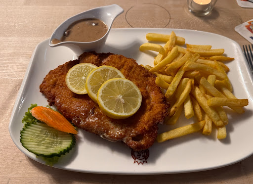 Zum Schnitzel: Für den Preis gibt es 2 Schnitzel , beilagensalat und pommes. Die Portion ist für gute Esser angemessen und sättigend ; nicht zu überladen. Schnitzel selbst, waren unserer Erfahrung nach bisher immer zart und die Panade kross. Die soße mit frischen Champignons und geschmacklich keine Tüten soße.