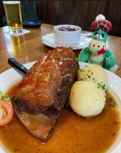 Fazit: ich hatte mich schon beim Reingehen in die Tafel mit dem Schriftzug "Fränkische Schäufela" verliebt. Diese bestellte ich auch und verzehrte sie mit Genuss. Schwarte kross, Soße kräftig und das Fleisch zart. Perfekt und auf den Punkt gegart. Dazu klasse Klöße und Rotkohl. Ich werde wiederkommen. Und SIR NESSI auch. Dem haben nämlich der Nachtisch aufs Haus auch noch...