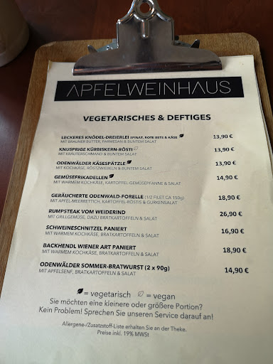 Read moreWir waren am 06.08.2025 in Michelstadt im Apfelweinhaus Schwarzer Adler. Für 4 Erwachsene und 1 Kind eine Stunde vor Öffnung noch eine Reservierung zu bekommen. Nicht schlecht. Allerdings war nicht die Rede davon draußen zu sitzen wo permanent Autos 🚗 an deinem Tisch vorbeigefahren. 😡Service war freudlich. Hätte aber zügiger sein können. Zu den Gerichten ist folgendes zu sagen. Laut Speisekarte:Backhendl Wiener Art paniert für 18,90!!Wenn dann da nur zwei kleine Hähnchenbrustteile auf dem Teller liegen. Na ja. Zweimal Odenwälder Käsespätzle a 14,90 Geschmachlich gut. Portionsgröße. Klein. Einmal. Spinatknödel. 14,90. War OK. Getränke kamen preislich natürlich noch dazu. Uns ist bei unserem Rundgang durch Michelstadt aufgefallen, das es hier eine große Anzahl von Restaurants vorhanden sind. Wir werden bei unserem nächsten Besuch was...