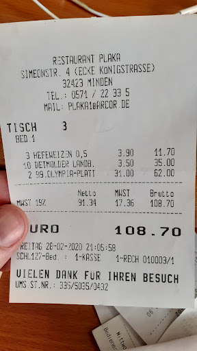 Wir waren heute das erste mal bei Plaka essen. Als Vorspeise gab es gebackenen Feta, der auch lecker war. Mit einer kleinen Änderung der Hauptspeise (Grillteller) von Steak auf Hähnchenfilet, war der Wirt bereits "leicht" überfordert..zudem haben wir eine kleine Portion Gyros bestellt, das haupsächlich aus sehr fettigem Fleisch bestand und wir es nicht verzehren konnten. Den Salat den wir vorab bekamen, war Zimmertemperatur. Das Hähnchenfilet was gegen zwei Steaks ausgetauscht wurde, war 1 Hähnchenfilet was einfach in der Hälfte geteilt wurde, aber als zwei verkauft wurde. Das Souflaki war sehr trocken. Rest war okay. Als wir anschließend die Rechnung verlangten, wurde uns die Rechnung einfach beim vorbeigehen auf den Tisch geklatscht. Für die kleine Portion Gyros und den Tausch von Steak auf Hähnchen wurden 10€ berechnet. Berechtigt? Denke nicht. Als wir die nicht gerechtfertigte Rechnung ansprachen, wurde uns die Karte auf den Tisch geknallt und wir sollen doch bitte die Rechnung selber ausrechnen, er hätte keine Zeit sich damit auseinander zu setzen. Daraufhin bat ich den Wirt darum nicht direkt so unfreundlich und laut mit uns zu reden. Sehr unprofessionell so mit seinen Gästen umzugehen. Wir sind anderes gewohnt und noch nie gab es Probleme wie hier.Weiswein wird warm serviert .Erste und...
