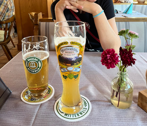 Read moreOmdat het zondag was, konden we kiezen uit soep en soep met pannenkoekenreepjes en als hoofdgerecht schweinenmedaillons. Das war est. Groot was onze verbazing dat iedereen om ons heen wél een ander gerecht van de kaart had mogen bestellen/ kunnen kiezen. De beide gerechten werden erg snel achter elkaar geserveerd. We waren nog niet eens klaar met de soep, toen het hoofdgerecht al op tafel werd gekwakt. Het toetje werd vergeten. Tijdens het willen afrekenen werd verteld dat er alleen contact betaald kon worden. We hadden allerhande kaarten bij ons maar niet voldoende contant. Op onze opmerking dat we dat zeer vreemd vonden, Duitsland, 2023, zelfs in Senegal kun je met pin betalen.., kregen we geen uitleg of verontschuldiging dat er in Mittenwald geen internet is ( is er natuurlijk gewoon prima) we werden letterlijk uitgehoond, way beyond uitgelachen. Belachelijk gemaakt voor alle gasten die er zaten. Een heel vriendelijke Duitse familie heeft voor ons contant betaald en we hebben ze ter plekke het bedrag teruggestort. Wat bij het restaurant niet mogelijk was, kennelijk hebben ze geen bankrekening. 🤣 De blonde serveerster, die sowieso al niet heel vriendelijk was tegen toeristen, liep ons, nadat de betaling geregeld was, voorbij alsof we niet bestonden, we bestelden een schnaps (dat tientje zat echt nog wel in de portemonnee) en kregen als antwoord ‘dat we toch geen geld hadden’. In 40-45 had ze het waarschijnlijk prima naar haar zin gehad. Eens...