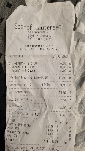 Read moreEs ist wirklich eine Location mit einem tollen Ausblick auf den Lautersee und das Karwendelgebirge. Wir waren in 14 Tagen zum 2. mal dort. Nach einer langen Wanderung haben meine Frau und ich mich auf ein Mittagessen gefreut. Der Kellner hat uns die Getränke, wie bestellt gebracht und bis dahin, alles gut. Ich wollte eine Scholle mit Bratkartoffeln und meine Frau eine Gullaschsuppe . Die kam auch sofort und die Mitteilung das alles an Fisch aus sei. OK dann nehme ich den Schweinebraten, der ist auch aus , ok dann den Spießbraten , ja ok, dann nehme ich den. Eine Familie neben uns nahm Platz und bestellte ihr essen und meine Frau war mit ihrer Suppe schon fertig, obwohl sie auf mich warten wollte. Da bekamen sie auch noch vor mir ihr essen. 🙈 Als ich den Kellner darauf ansprach, das wir gerne zusammen gegessen hätten sagte er zu mir: Der Koch ist Schuld und bitte machen sie mich nicht so an deswegen. Ich habe dann die Rechnung verlangt und bin ohne Essen weiter gelaufen. Also ich habe selber in der Gastronomie gearbeitet und weiß ja das wir einen Fachkräftemangel haben, aber das der Gast wegen solchen Kellnern leiden muss ist wirklich sehr schade. Service 6. Es war unserer letzter Besuch dort und ich kann es auch nicht...