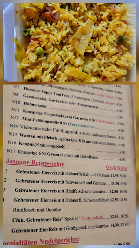 Später am Abend dann die böse Überraschung. Keine köstlich-würzigen gebratenen Nudeln mit zartem Hühnchen und leckerem Gemüse, sondern krümeliger trocken-fettiger Reis mit wenigen, gedünsteten Zwiebeln und 2-3 grünen Erbsen und Möhrenwürfelchen. Sonst nichts. Keine Spur von Hühnchen oder anderem Fleisch. Leider ein Fall für den Mülleimer. So ein Gericht steht nicht mal in der Speisekarte, die wir uns am Nachmittag für künftige Bestellungen mitgenommen hatten. Auch der Preis von 10,50 Euro pro Portion ließ sich dem, was man uns kredenzt hatte überhaupt nicht zuordnen. Wir waren nicht nur hungrig, sondern auch echt sauer.