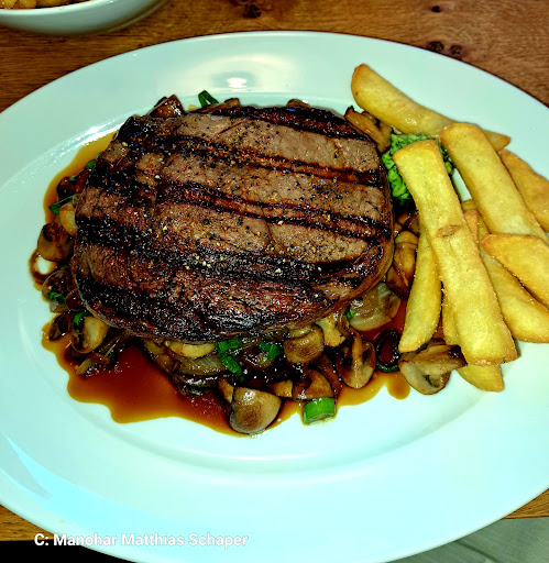 Read moreEin traditioneller, historischer Landgasthof, geführt von einem jungen, guten Küchenmeister, der natürlich auch Landwirt und Jäger ist. Denn die meisten Produkte kommen vom eigenen Betrieb. Rustikale und dennoch feine Speisekarte, die mit den tradierten alten Gerichten in jungem, zeitgemäßen Design durchaus die Handschrift des Küchenchefs Torben Paulsen ausmachen. Und gleich mit dabei: ein kleiner Hofladen, in welchem von Rindfleisch Produkten über Käsen, vegetarische Pastagerichte bis hin zu Dinkelnudeln aus eigener Produktion einiges zu finden ist. Wer hier her kommt sollte also gleich den finanziellen Spielraum etwas erweitern. Ansonsten top Qualität.....ausgezeichnet.... Wir, meine Liebste und ich, hatten einen Tisch reserviert. Wir hatten ein gegrilltes 400gr Ribeye Steak vom eigenen Welsh Black auf Pilz-Zwiebel Pfanne, einmal mit Salat, dazu einmalig gute Steakhouse Pommes. Auf den Punkt gegrillt, und sensationell zart..... Die gute Kräuterbutter hat es perfekt abgerundet..... Dazu gabs ein Kellerbier vom Fass. Der Service tiptop.... Da hab ich dann gerne auch ein gutes Trinkgeld...