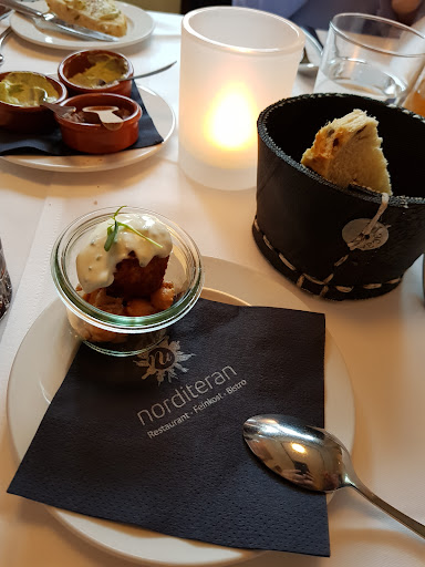 Read moreWer gehobene Gastronomie schätzt ist im Restaurant norditeran richtig. Kleine Tageskarte mit Menuefolge. Lässt sich auch gut mit den anderen Gerichten kombinieren. Wird vermutlich öfters gewechselt da man auf der Internetseite keine richtige Vorschau darauf bekommt. Von Fleisch bis Fisch alles dabei. Wer vegetarisch liebt wird sich vermutlich nur mit der Vorspeise begnügen müssen. Das essen rundum ein Genuss. Zu Beginn wurde etwas selbstgemachtes Brot mit Gewürzter Creme serviert. Dann folgte ein Gruss des Hauses. Sehr köstlich! Ich hatte eine Liebevoll angerichtete Vorspeise, die mit den Aromen sehr spielt. Für den leichten Hunger geht auch einfach ein Zwischengang. Bei mir war er sehr Harmonisch abgestimmt war. Die Getränke Auswahl bietet eine Reihe von Weinen. Wer etwas anderes wie Bier oder Alkohlfrei wünscht auch kein Problem. Die Preise für das Essen sind der Qualität angepasst und auch angemessen. Service sehr zu vorkomment. Am Anfang wurde sehr schön hervorgehoben was angeboten wird. Auf ein köstliches Dessert wurde hingewiesen. Ambiente dezent dem nordischen angepasst. Ein kleiner Minuspunkt zum Ambiente, der Gastraum benötigt leichte Renovierungs arbeiten. Das müsste mit etwas Farbe aber schnell behoben sein. Mein Fazit, das Restaurant norditeran ist ein Geheimtipp...