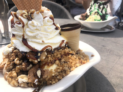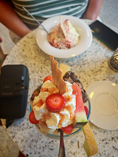 Read moreAlso erstmal mal draußen gesessen, keine Bedienung. Dann wegen 100 Wespen reingegangen, den Kellner extra noch gefragt ob das ok ist. Nach 15 Minuten hat dann endlich jemand gemerkt das wir auch was essen wollen bei 40 grad ohne Klimaanlage in der Eisdiele. 1 x Fruchtbecher 10,10€, 1 x Spaghetti Eis 8,60€ waren in 4 Minuten da. OK der Teller vom Spaghetti Eis hatte 100 Fingerabdrücke die man natürlich so richtig schön sieht in der Sonne, der Fruchtbecher sah gut aus, aber das war's auch schon. Die Banane war schon braun, die Ananas war auch schon gammelig, das Eis muß ich sagen war nun das Zitrone was wohl keiner essen wollte weil es sehr sauer war, aber dafür hatte man jede Menge Sahne drauf 🫢. OK die Stühle klebrig und fast alle oben offen, so das der Schaumstoff rausguckte, auf der Fensterbank jede Menge...