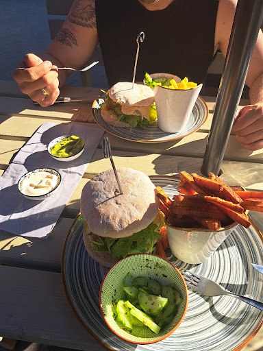 Read moreWir waren spontan dort zum Essen. An einem Tag mit drückenden 30 °C. Draußen vor dem Lokal, im zur Straße hin, abgesenktem und von verschiedenen Grünpflanzen umgebenem Biergarten. Ein kleiner Brunnen und schattenspendene Sonnenschirme sorgen für etwas Abkühlung. Auch drum herum alles sauber und ordentlich. Ein kleiner Hinweis am Tisch "bitte im Lokal bestellen". Uns, wie auch anderen Gästen wurde die Karte von einer charmanten Bedienung gebracht. Sehr freundlich und unaufdringlich. Die Speisekarte bietet eine kleine aber feine Auswahl verschiedener Getränke und Speisen, vegetarisch, vegan und Fleischgerichten welche Lokal aus der Umgebung und in Bio-Qualität angeboten werden. Ob auch auf Unverträglichkeiten (z.B. Glutenfrei) geachtet wird, kann ich nicht beurteilen da ich darauf nicht geachtet habe. Das Preis-Leistungsverhältnis ist moderat und hätte ich für diese Qualität, höher erwartet. Im Angebot Tapas, Salatbowls, Steak, Burger, Pommes aus Kartoffeln oder Süßkartoffeln und Flammkuchen soweit ich mich erinnere. Ich hatte " die sanfte Ziege" Einen Burger der auf einer Platte mit einem frischen Gurkensalat angerichtet wurde. Ein echter Augenschmaus! Ein 180g Rindfleischburger, mit Gewürzgurke, Tomate, Salatblätter und Ziegenkäse. Die Buns mit einer leckeren Creme bestrichen. Ich habe selten einen so leckeren und saftigen Burger gegessen. Die Kombie aller verwendeten Zutaten war sehr fein abgestimmt zusammengestellt. Für mich 5 Sterne wert. Nun, mein Mann hatte sich eine Currywurst mit Pommes bestellt. Und da scheiden sich die Meinungen. Die Darbietung der Currywurst (im ganzen, mit Curry und Soße) auf einer Platte, die Pommes goldgelb, fingerdick in einem großen Steigutbecher mit einem kleinem Schüsselchen Mayonnaise und einem Gurkensalat frisch dazu als Beilage, wird auch in einem Schüsselchen auf der Platte serviert. Sie sieht sehr schmackhaft aus. Am Nachbartisch die Gäste, lobten den guten Geschmack. Weshalb ich dieses Gericht nicht negativ bewerten bzw. nicht bewerten möchte. Wir kommen aus NRW. Bei uns ist die Currywurst auf Basis einer Bratwurst, die gebraten und in kleinen Scheiben geschnitten, mit Curry gewürzt und mit einer tomatenlastigen Gewürzsoße übergossen, serviert wird. Mein Mann hat die Currywurst gegessen und sie ist ihm gut bekommen. Beim nächsten Mal ißt er dann auch Burger.