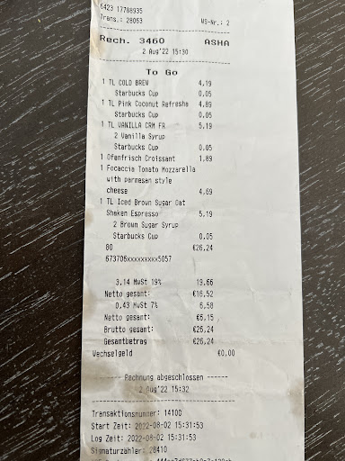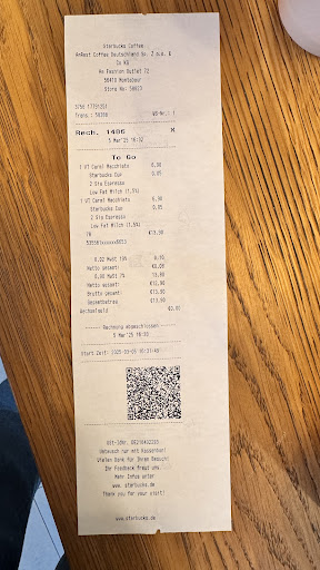 Anfang dieses Monats habe ich in Ihrer Filiale zwei Venti Caramel Macchiatos bestellt. Nachdem ich den Laden verlassen hatte, stellte ich jedoch fest, dass beide GetrĂ€nke kleiner als erwartet waren und eher der GröĂe Grande entsprachen. Um sicherzustellen, dass kein Fehler vorlag, kehrte ich sofort mit meinem Kassenbon zurĂŒck und fragte das Personal. Allerdings wurde mir versichert, dass die GröĂe korrekt sei und kein Fehler gemacht wurde. Da ich es in dem Moment nicht weiter ĂŒberprĂŒfen konnte, musste ich diese Antwort akzeptieren.