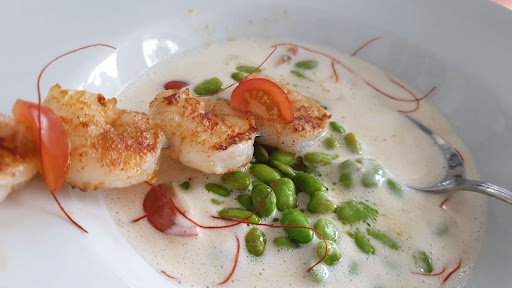 Wer sich das nun "traut", der bestelle mal etwas von der Zusatzkarte, auf der auch saisonale Dinge angeboten werden. Er wird aus dem Staunen nicht raus kommen, denn jetzt wird es kreativ und lecker sowieso. Unlängst hatte mein Mann die Tagliata vom Schweinefilet auf Ruccula-Salat mit Parmesan und ich hatte die Kaitums Garnelen auf jungen Bohnenkernen mit Schinkenchips. Ein Traum, kann ich nur sagen. Das Schweinefilet war natürlich perfekt gebraten und alles andere als trocken, was ja bei Schweinefilet in Restaurants schon mal gern passiert. Hier nicht! Und meine Garnelen. Ich werde in 10 Jahren noch davon schwärmen. Außen knusprig und innen noch leicht glasig. So saftig und schmackhaft. Dass Sößchen ein Traum, die kleinen Bohnenkerne knackig und alles abgerundet mit ein wenig Zitronenöl. Fürs Auge gabs ein paar Chilifäden. Ganz ehrlich, ich weiß nicht, wann ich das letzte Mal bessere Garnelen hatte.