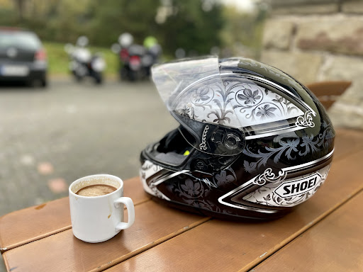 Hier parken viele Biker. Leider sind es tw unvorsichtige und egoistische Menschen. Mein Partner hatte seinen Helm am Motorrad gelassen, pleng pong wir haben nur was gehört. Nichts gesehen, der Helm lag wie vorher oben... Plötzlich war das Visier gebrochen. Er musste mit defektem Visier nach Hause fahren ohne dass sich jemand geoutet hätte einen Helm herunter gestoßen zu haben... Man geht auch gerne mal mit Nieten an der Jacke an anderen Mopeds vorbei ... Ich überlege beim nächsten Mal weit weg zu parken. Also groß Kontakt haben wir noch nicht bekommen. Hier kommen auch Blender hin...