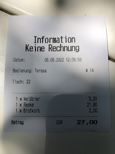 Read moreIf you don’t like serving people, you shouldn’t be serving people. I arrived @11:45. I was told the place opens @noon. My petition whether I could sit on the terrace and start looking at the menu was rejected. When I ordered, I asked if the fish could be accompanied with veggies instead of potatoes. I was told I could have asparagus for an additional charge of €8 euro. I refused the offer. I was offered bread instead. That was charged with €2 euro on the bill without notifying me. All in all, I wouldn’t return in spite of the nice spot next to the lake. Only the waitress who allegedly started two days prior saved the day. She tried to help and stood out from the overall atmosphere in the place. I attach the ‘information’ I received with payment. €27 for grilled fish, two slices...