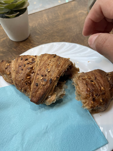 Tried their French pastry today. The tarte aux poires and the baguette look yummy, priced respectively at 2.60€ and 3.50€ per piece. The wholegrain croissant is intriguing and worth a try. It has a different flavor than the regular croissant, seemingly with less butter, but despite the use of wholegrain flour, the butter is well incorporated into the dough. However, it's a pity that it has the flavor of a wholegrain bun and not a croissant, partially due to the flaxseeds and sunflower seeds on top. The croissant filled with apricot jam is average also overbaked.