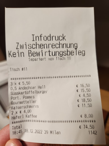Read moreBe careful, check the receipt! The food has potential but we will not return. We ate here in September and were treated very rudely by our waiter. We were barely greeted and were thrown the menus on the table. We were told very rudely that we have 1h and not one minute more, then we have to leave. The service was poor throughout the meal, and the waiter made us feel unwelcome and very uncomfortable. We were having dinner with our children and with our grandparents and the grandparents were shocked by the appalling attitude of the waiter. After the meal we were presented the bill and we saw that we were charged a lump 15€ service fee (tip) on the receipt! This is unacceptable, as in Germany tipping is a courtesy of the customer, and is not to be added by default like in the USA. We were told by the waiter that it is a fee that they charge during Oktoberfest and that there is nothing he can do about it. Also, we realized that we were charged double for the kids' menu. After complaining to the manager or person in charge, we were refunded 25€, which is fair and we appreciate. That being said, the duck was good, Spätzle below average, so there is potential; however we don't appreciate being treated disrespectfully, nor being ripped off, and therefore will not come back to this place. The Andechser am Dom business will unfortunately not notice losing us as customers, as it is in a prime location that gets flooded by tourists, but we'll also not recommend this place to others and won't come here to host business dinners...