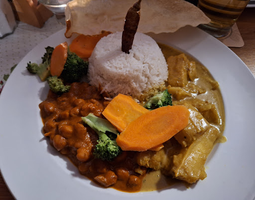 über die quali des essens lässt sich hier und da streiten, aber allein die kuriose zusammenstellung der speisekarte von wirtshausklassikern über die berliner currywurst bis hin zu "echten" curry gerichten hat fünf sterne verdient. alles zum thema speisen verdanken wir dem hochmotivierten koch aus sri lanka, der auf kleinstem raum mit bis zu zwei küchenhilfen alles mögliche zaubern kann, und so ziemlich alles möglich macht, wenn man mal sonderwünsche hat. ... und das alles zu mehr als fairen preisen.
