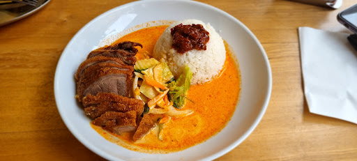 Tried tom kha gai, duck with peanut sauce, and tofu veg in red curry. All dishes had much of the same veg (red peppers, carrots, leek, mushrooms), but the duck and tofu also had zucchini, broccoli, and cabbage. All were cooked quickly and the duck was better than at most restaurants we've tried it at - it was crispy, tender, and not overly fatty. Definitely worth ordering as it's often disappointing. Red Curry was the spiciest, but not overly so. Quantity of food in each dish was good, and it was great to have the rice in a mound on one side so that you could determine how much you wanted in each bite with how much sauce. Value for money was excellent. 2 tables for 4 and one table for 2 available outside, more tables within. Though they were supposedly closed at 7:30pm, they still cooked and served for people who arrived just after that. The summer rolls delivered to the neighboring table looked delicious too. Would definitely be a regular if I...