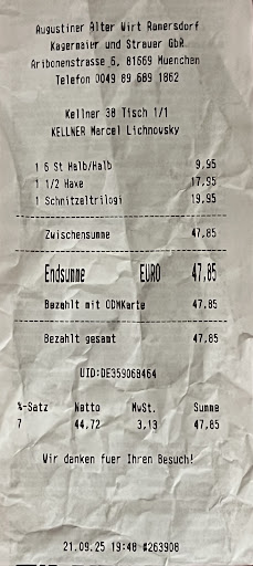 Read moreThis "biergarten", probably less known compared to many others in Munich, lies in a really charming spot close to the old church in Ramersdorf. Wonderful place and great atmosphere! That's why I give it the two stars of my rating. Apart from that, everything was a great deception: very bad service, unfriendly staff, and last but not least, the worse beer we've ever had in Munich! It was supposed to be an "Augustiner" which is a great beer, but we had all doubts about having a lot of water in our two "helles" and one " alkoholfrei weissbier". Two years later (June 2023) after my previous review (2021), I wanted to give this place a second chance, hoping that things could have changed for the better. But: nothing has changed, except for the service, which has changed for the worse! Two hours waiting time for a snitzel without any explanation or excuse, most arrogant waiter having problems with adding numbers. I could not give the service 0/5, that's why it appears...