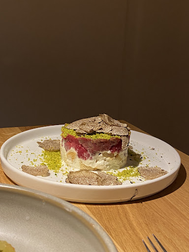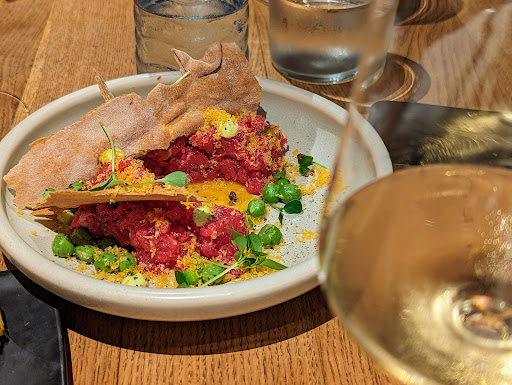 Read moreThe tapas are way overpriced. We went as a group of 8 and took the 50€ per person Waiters Choice, with wine pairing, the total bill was beyond 1,000€. We got about 7 different dishes, each dish came in 3-4 separate plates for sharing, so some dishes were even shared among 3 people. To be fair, the beef tartare and the halibut were good, but the rest 5: poree, grilled cabbage, aubergine, pork belly and apricot cannot justify the price. Also the portions for the better food like tartare and halibut were quite small, they're basically one-person portions. After a night of wine tasting, we left feeling each needed a Brezel or a burger still. For the wine pairing, we got 6-7 bottles of wine, white and red mix, with the most expensive one being a 1994 Chateau Teynac Red. Considering that more than 50€ per person went to the wine, I expect more unique offerings. Hence the rating. The food alone, the service and the atmosphere are decent, but at this price, it will be inevitably compared to the upscaled steakhouses or lobster...