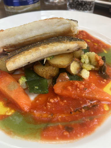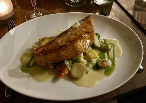 The mixed starter was delicious and rich in choice: perfectly cooked prawns, fresh burrata, tuna tataki, a fluffy pea frittata, olives, couscous, etc. The main of perfectly cooked salmon on a bed of roasted baby potatoes and vegetables was scrumptious. The cooking is great and the quality of ingredients used is high.