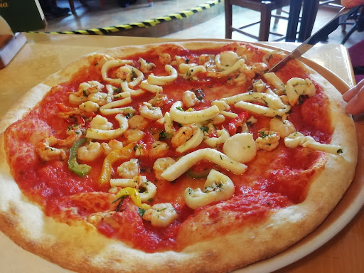 the al boccocini pizza was ordered. their pizzas have a thin, crispy crust, which has a lovely texture although can make for a delicate pizza base, so even cutting pizza (they don't cut it for you) my cut in into quarters or you'll get 'floppy ends' when you attempt to eat it - leaving to toppings falling off. the toppings themselves were nice, the buffalo mozzarella was moist, and the rocket was crisp. the tomato sauce could've been a bit more flavoured, though. the pizzs al salamino piccante was also nice, greasier than the boccocini though. it wasn't extremely spicy, either. but the base was a bit soggy. the pizza ai frutti di mare was also ordered, and the seafood topping was very nice. all the pizzas were very filling, so we had no room for a dessert unfortunately.