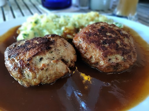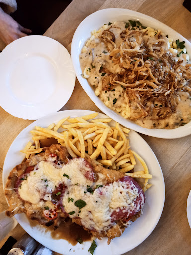 I ordered schnitzel with salami and cheese on top, dressed in gravy, and lean pork steaks with mushroom sauce and käsespätzle as the side. The food was delicious, not like exceptional, but tastes "homey". I was particularly amazed by the meat, which was cooked perfectly and tender. The käsespätzle was creamy and cheesy, which is good news! The portions are huuuuuge, very worth the price. And they have good beer as well. I'm definitely keen for...