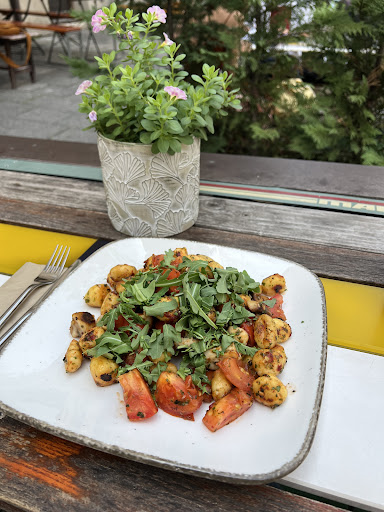 Read moreI saw that this place was recommended for good vegetarian/vegan options in Munich so I had to stop by, and it certainly did not disappoint. I got the fried gnocchi with tomato and arugula (with added mushrooms) and a chocolate coconut cream cake. Both were delicious! The outdoor seating is so cute and the trees between the tables add some privacy. I definitely recommend coming here! It’s hard to choose what to order since everything is so good, but that’s a problem I...