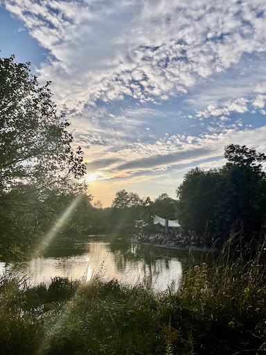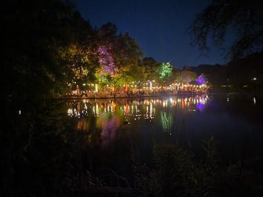 The cafe has a prime location overlooking the lake in the park, and multiple food stands are available to try out, and a small stage for live music, making it a cool place to enjoy a morning coffee with your partner or a cold beer during a nice evening.