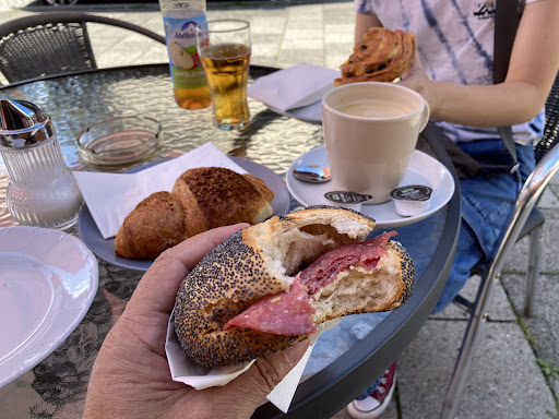 Abbiamo preso un panino salame e burro, un croissant con ripieno di crema di nocciola, una girella al cioccolato, un succo di mela e un caffè lungo.