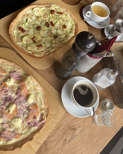 I recently visited Cafino and had the pleasure of trying their vegetarian Fladenbrot—an absolute delight! The bread was perfectly baked, with a crisp, golden crust and a soft, airy interior. The filling was a flavorful mix of grilled zucchini and toasted pine nuts, complemented by creamy cheese and fragrant herbs. The slight crunch of the pine nuts added a wonderful texture, making every bite even more enjoyable.
