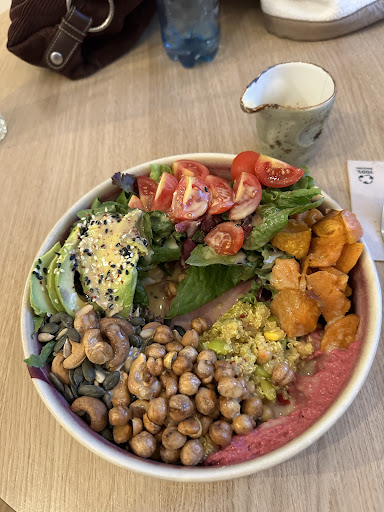 Read moreIch habe dort vor ein paar Tagen eine Salat Bowl getestet. Ich hatte privat in der Gegend zu tun, und außerdem wollte ich auch mal zum Mittagessen was anderes ausprobieren. Von dem Kaffee habe ich schon öfters gehört gehabt, aber ich hatte noch nicht die Möglichkeit dort hinzugehen aber am Mittwoch war es soweit. Ich habe meine Salat Bowl ein bisschen abändern lassen weil ich keine gebratene Zucchini und keinen gebackenen Kürbis mag. Habe dann aber dafür mehr Avocado bekommen und es war sehr köstlich. Viel knackiges frisches Gemüse und ein leckeres, leicht süßliches würziges Dressing dazu. Die süßen Sachen habe ich zwar wegen meiner Corona Pfunde nicht getestet aber dafür habe ich einen Chai Latte getrunken mit Espressoshot, und der hat mir auch sehr gut gefallen. Im Hintergrund wurde ich audiomäßig noch beglückt mit guter Musik aus den Zweitausendern. Was das bezahlen der Waren angeht arbeitet das Café völlig ohne Bargeld. Das bei manchen Menschen Läden mit nur Barzahlung nicht immer bestens ankommen habe ich auch schon kapiert, aber bei der umgekehrten Methode wäre ich mir persönlich auch nicht sicher, ob das eine ideale Lösung sein könnte. Sowohl als auch finde ich immer noch am kundenspezifischsten. Das habe ich schon vor Ort angeführt und ich bin nicht auf taube Ohren gestoßen. Im Allgemeinen ist das Café was kleineres, die Räumlichkeit macht auf mich einen gemütlichen Eindruck und laut ist es da drin auch nicht. Und auch dann nicht wenn es voller wird. Wobei ich anmerken muss dass ich durchaus bei anderen (auch gesunden) lokalen schon anderes erleben durfte. Fazit: gemütliches Kaffee mit guter Musik, leckerem gesunden Essen und tollen Leuten. Man muss sich nicht immer den Bauch mit unnötigen Kalorien vollschlagen um einen tollen (Nach)Mittag...