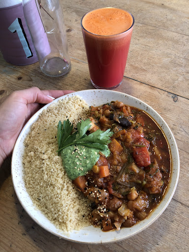 Yo! One more healthy veg spot in Munich.. Homemade dishes. I tried the couscous with Moroccan style veggies, very good. Other options looked also delicious, however not much protein in the dishes. The cold pressed fresh juice with carrot, beetroot and ginger was a real plus. The brownie is excellent, not sweet and still a treat. And the raspberry bite is a realfood snack option to gain some energy while enjoying a delightful taste. One so/so thing was the matcha latte, definitely needs way more matcha than what was offered, as it was literally a white vegan milk drink, I couldn’t feel the matcha at all, even though I asked to have it well green.. The service was great, the team is nice, smiling and welcoming. I would for sure come back to try the other desserts and sweets that...