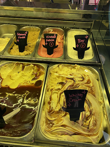 The best ice cream in Munich, and one of the best (if not the best) I've ever had. And I've tried icecreams across Europe, all the way to Japan and back. This one...hands down the best. It's quirky, it's exciting, it's dense, it's high quality, it's just superb. The fact that they change flavors every day is genius. Also, there are no boring typical flavors which you would expect (like vanilla, chocolate, etc). Every flavor is something...exciting and new, combination of different fruits or chocolates/desserts/cakes/sweets/liquors/drinks/cocktails. You never know which flavors they will have, until you visit. Also there is always a flavor (or two) of some local dish or something currently relevant, as a joke (weißbier, sauerkraut, corona, pride month, etc). With every icecream you buy, you can pick 1 flavor which you want to try, so they will scoop a tiny bit for you and put it in the icecream which you bought. Price is a bit higher than the regular local icecream (2euro/scoop), but it's absolutely worth it + scoops are really big. I am glad I don't have this place in my neighbourhood because I would be there literally every single day and get fat just by eating all the icecream. Probably in my top 3 food...