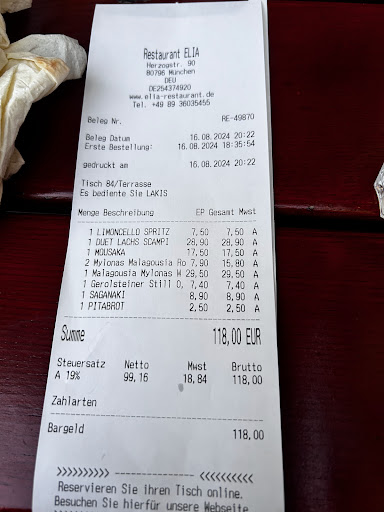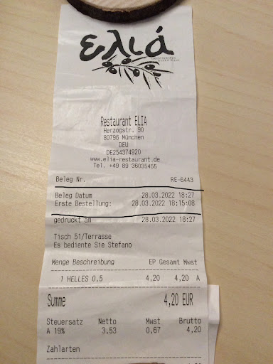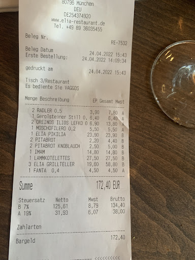 Very cosy place. You feel welcome as soon as you enter the restaurant. There is a nice long bar right at the entrance. The place was very well visited without being loud. While waiting at the bar for a free table we were not asked if we wanted to drink anything which was suprising - that is the reason why I did not give and "excellent" for the service. Once at the table everything was perfect. The service was very nice and forthcomming, the warm feta cheese and the olives for the entreée were amazing and the white wine, while not exceptional, was very good when taking in consideration that it was very affordable. My main dish was grilled gilthead seabream and it is the best fish I have had in Munich so far! The side dish salat had a wonderful dressing as well. The Ouzo rounded up the dinner and we had a great conversation with the waiter who took the time to explain a little about...