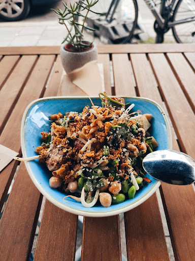 Gestern zum ersten Mal dort bestellt und abgeholt (lobenswert: wird in der Pappschüssel mitgegeben). Ich hatte eine Build-Your-Own: Reis als Grundlage Lachs UND Garnelen Gurke, Edamame, Karotten, Koriander Limetten-Erdnussoße Avocado-Topping Kokos-Cashew-Crunch