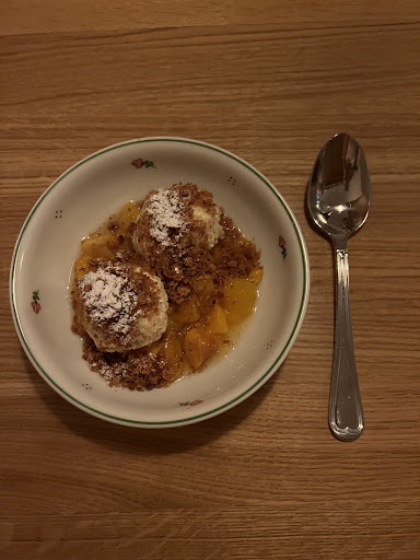 Had the traditional dessert. Turns out it's that Julius Brandtner bread gone stale, now upcycled (by frying it and sprinkling sugar on it), with plum jam on it. My mother used to make something like that in my childhood, so as not to have to throw away stale bread. But 11 euros for that?