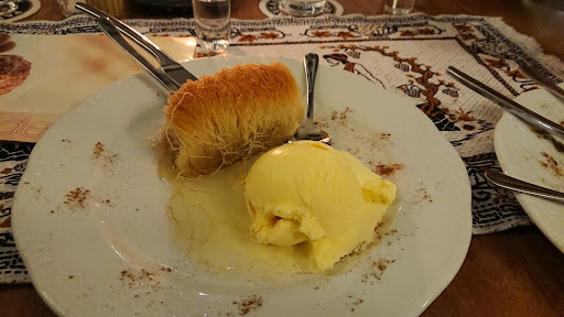Wir versuchten uns an einem Dessert und bestellten Baklava mit Vanilleeis. (Wenn der Kellner dann mal an den Tisch kam). Ich hätte schon stutzig werden müssen, als das Baklava mit einem Steakmesser serviert wurde, aber das war bitter nötig. Noch nie habe ich ein derart hartes und zähes Baklava gegessen. Es war mit Messer und Gabel kaum zu schneiden und sehr ledrig im Biss. Das Vanilleeeis voller Eiskristalle.