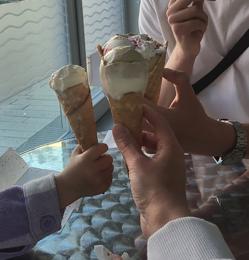 Die Atmosphäre in der Eisdiele war einfach zauberhaft. Die Einrichtung war stilvoll und einladend, und die Musik im Hintergrund trug zur entspannten Stimmung bei. Ob drinnen oder draußen, es war der ideale Ort, um eine Pause einzulegen und die kulinarischen Genüsse zu genießen.