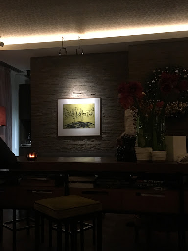 Cozy, sophisticated, warm atmosphere, with some great art. Looks like a nice patio in the summer too.
