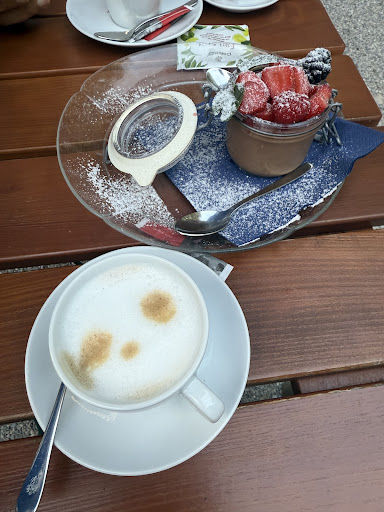 Da wir am Nachmittag dort waren, haben wir nichts großes Großes gegessen. Brotzeit war ausreichend, also bestellten wir die "sauren Drei" (Presssack, Wurstsalat und eingelegter Limburger) und "besoffene Wassermelone". Ersteres war gut und eine großzügige Portion. Zweiteres hatte eine leckere Kugel Joghurteis und war schön angerichtet. Leider war die Melone schon ziemlich lange in der Marinade aus Rum, Honig, Minze und Limette, dadurch war die Konsistenz der Melone ziemlich matschig. Auch war der Geschmack des Honigs so vorherrschend, dass es nur danach geschmeckt hat. Ich bin mir nicht mal sicher, ob dort wirklich Rum dabei war. Wenn ich schon mit 'besoffen' werbe, dann darf da auch ruhig ein ordentlicher Schuss Rum mit hinzu.