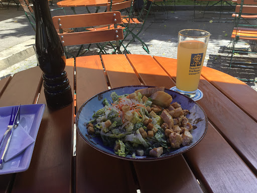 Aber wirklich enttäuscht hat mich der Service und das hat zweierlei Gründe. Da wäre zum einem das Verhalten bei einer Windböe und drei Tropfen Regen (mehr gab es den ganzen Tag nicht). Die Belegschaft aus 5-6 Kellnern baute sofort den Großteil des Biergartens ab, sodass nur noch die übrigen Gäste unter Schirmen hockte. Es setzten sich neue Gäste zu uns in den Loungebereich, denen aber mitgeteilt wurde, dass draußen kein Service mehr stattfindet wegen Sturm (der nie kam). Die Rechnung, die wir noch vor dem großen Abbau bestellt haben, kam immer noch nicht. Stattdessen wurden andere Gäste dann doch noch bedient. Wir haben noch nie so lange auf eine Rechnung gewartet. Generell waren die Wartezeiten ziemlich lange und über Arbeitsmoral und Prioritäten sollte man hier mal nachdenken. Es war nicht viel los, der Biergarten nur etwa zur Hälfte voll und im Schankraum saß so gut wie niemand und es waren ungefähr sechs bis sieben Kellner da. Trotzdem mussten wir ewig warten. Das lag definitiv darin, das drei arbeiten und der Rest am rauchen oder quatschen war. Das sollte man definitiv nicht vor den Gästen machen. Dann erhielt ich mein Gericht lange vor meinem Begleiter, so dass ich bereits fast fertig war, bis er seines bekam. So etwas sollte normal nicht passieren.