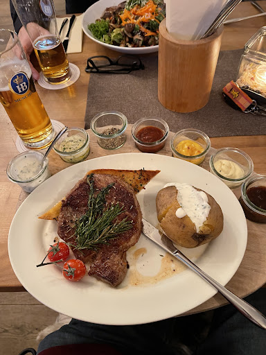 Das Essen: Das Schnitzel ist ne Wucht! Der Schweinebraten schmeckt und wurde mit einem großen Stück Kruste gebracht! Auch die Souce ist genug. Hier machen andere oft Abstriche! Das Bier ist gut, auch die Krüge sind angenehm! 0,4 Liter Spezi. Hier sehe ich auf 0,5 leicht Verbesserungsbedarf. Das kleinere Glas verwirrt und lässt da irgendwie ein komisches Gefühl zurück. Irgendwas zwischen: "Verdammt hätte ich mir bloß n Bier bestellt" oder "Ohje das ist ruckzuck geleert". Bitte macht hier 0,5 draus!