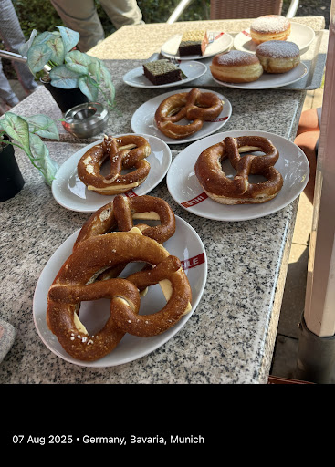 Bavarian Breakfast in Munich This is a super authentic and yummy spread of classic Bavarian treats. The best part, for sure, is the big pile of pretzels (Brezen). They have that perfect dark, shiny crust and look perfectly baked super crispy on the outside and soft on the inside. That's how you know they're really good! The rest of the meal is great too, with classic sweet stuff like those sugary doughnuts (Krapfen) and a thick, moist-looking brownie or chocolate slice. That mix of salty pretzels and sweet desserts makes it a truly great breakfast. It's all set up nicely but keeps it simple, focusing on how fresh and tasty these local favorites are. Overall, this is the perfect, classic way to start your...