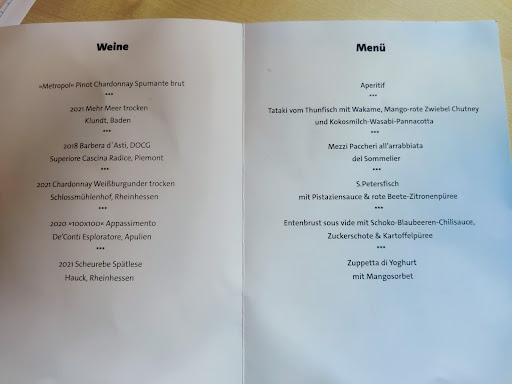 Allein beim Dessertwein, einer 2021 Scheurebe von Hauck, war der Kellner so gnädig, zumindest 0,1 L anzustreben. Die Zuppetta di Yoghurt war in Ordnung.