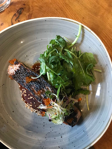 • Horenso No Goma-Ae: could have been way better. Their Goma-Ae was served slightly warm and the whole dish was too watery. The spinach should have been steamed more, chilled and been more dense. Also a bit of a lack of flavour. This one made me a bit sad • Crispy Duck Salad: very good but the duck was a bit too junky, could have done with a bit more greens to counterbalance the duck • Crispy and Spicy Tuna Tempura Roll: not that great, there was too much going on and a lack of flavour at the same time • Teriyaki Salmon Robata: this was rather delicious but I should have ordered rice with it, note to self • Black Angus Dry Aged Entrecôte: this was a bit of a joke really. The meat quality was not that great and they didn’t chop it properly so it made it rather tricky to eat with chopsticks, which took away the pleasure somewhat