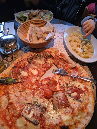 Food - Aubergine on pizza could have their skin removed, they slice it vertically so on the side you really eat just skin. Salad and Pasta were ok.